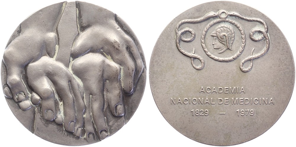 1979 España. Academia Nacional de Medicina 1829-1979. Vier handen. / Tekst onder twee slangen een medaillon met klassiek hoofdje vasthoudend. AR 50 [66,71 gr.], nr. 267 in rand. Prachtig.