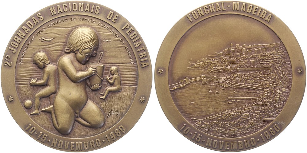 1980 Madeira-Funchal, 2AS Jornadas Nacionais de Pediatria. Drie spelende naakte kinderen op het strand. / Gezicht op de haven van Funchal. Æ 78. Galtazan. Prachtig.