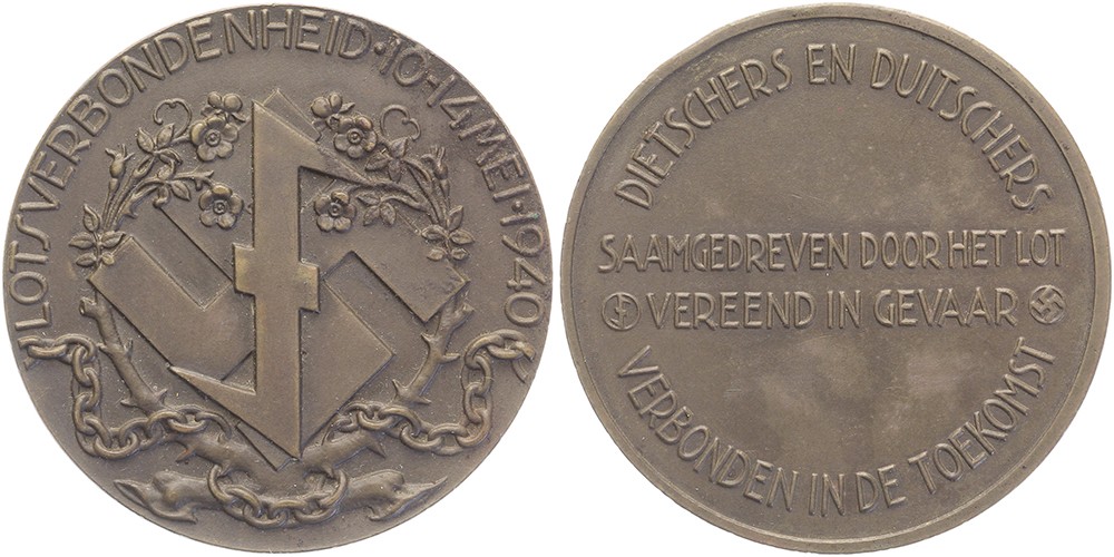 1940 Lotsverbondenheid Dietschers en Duitsers. Wolfsangel op hakenkruis. / Op- en omschrift. Æ 40. Prachtig.