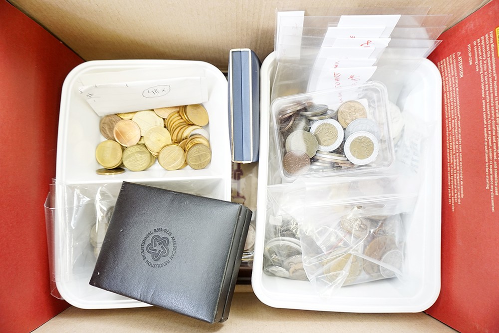 Schoenendoos met zeer divers modern penningspul o.a. winkelwagen muntjes, schoolgeld, medailles etc.