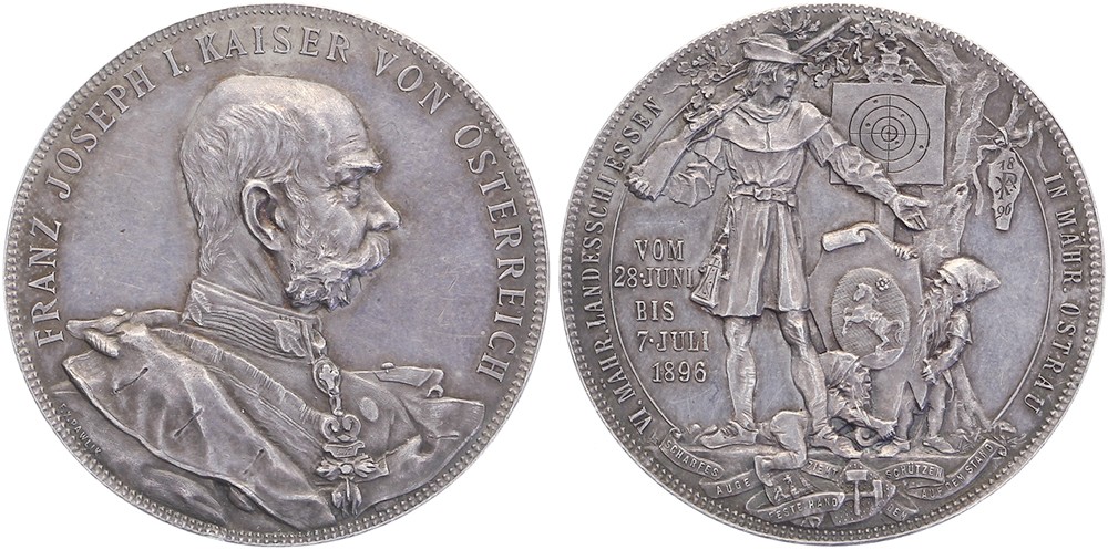 1896 Ostrau, 6. Mähr. Landesschiessen. Brustbild Kaiser Franz Joseph nach rechts. / Stehende Schütze und zwei Zwerge mit dem Stadtschild; im Hintergrund Baum mit Zielscheibe. AR 35,7 [23,43 g]. Slg. Horsky 3877; Slg. Peltzer 1892. F.X. Pawlik. Vorzüglich.