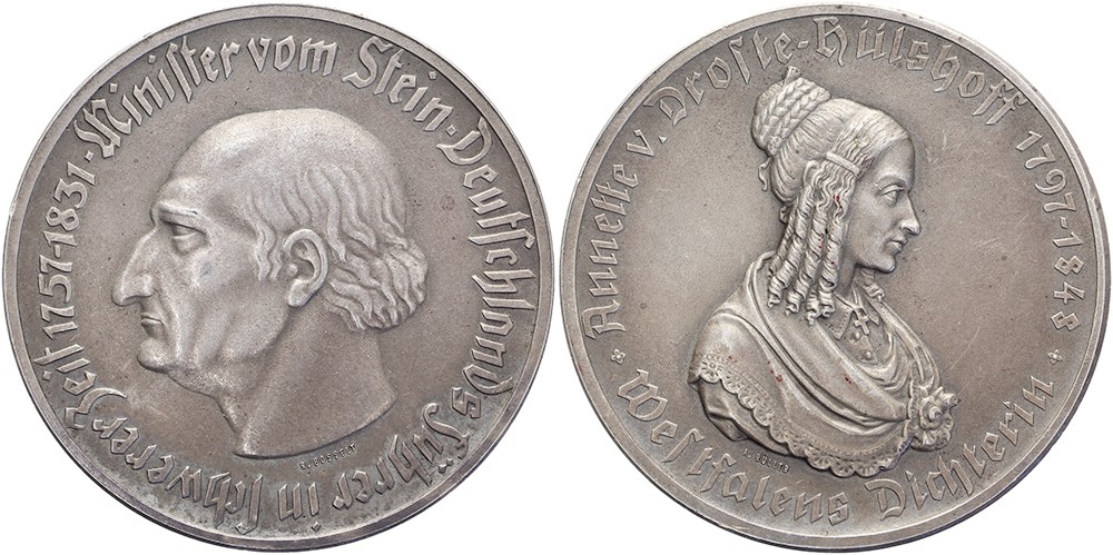o.J. (1923) Westfalen. Zwittermedaille. Kopf Minister vom Stein nach links. / Dichterin Annette von Droste-Hülshoff. Neusilber, versilbert 44,4. Jaeger N29. R. Bosselt & A. Rüller. Fast vorzüglich.
