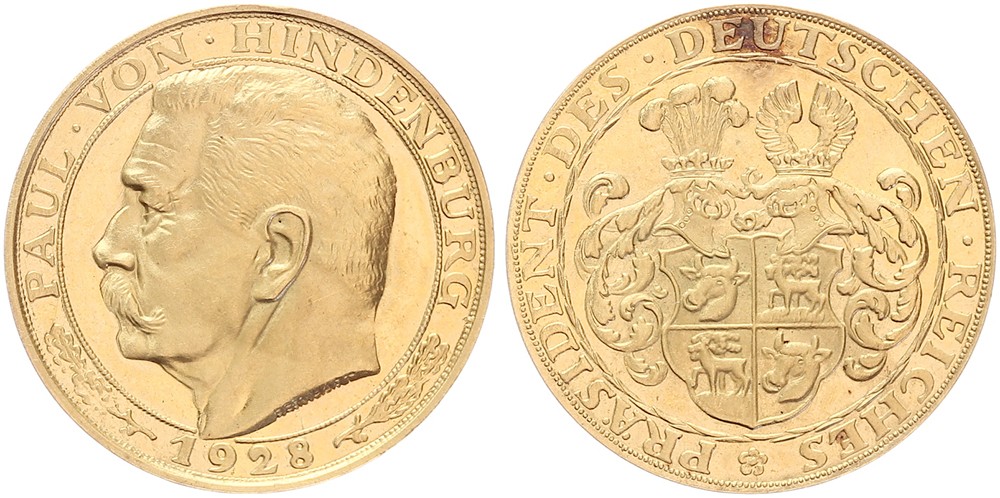1928 Paul von Hindenburg, Präsident des deutschen Reiches. Kopf nach links. / Zweifaches gehelmtes Wappen. AU 22,6 [6,49 g, 750/1000]. Bernhart. Fast Stempelglanz.