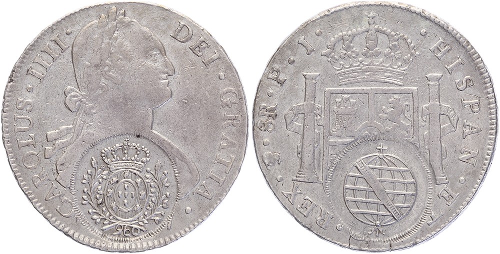 960 Reis (1809) counterstamp on an 8 Reales 1807 Potosi of Carolus III (Bolivia). KM 242. Host coin: VF; counterstamp: VF / EF. Ex veiling 292 Robert Schulman, juni 1991, kavel 683