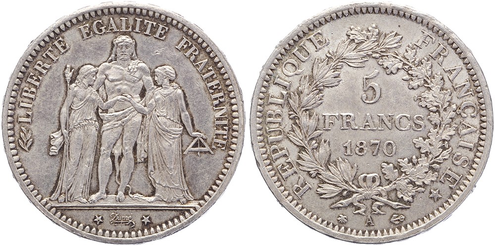 5 Francs 1870A, type Hercule. Gadoury 745; KM 820.1. Superbe.