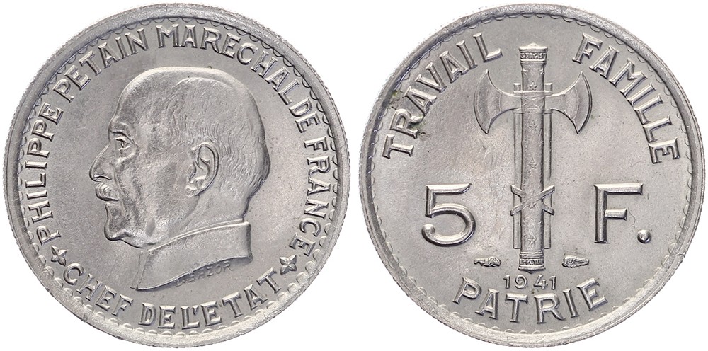 5 Francs 1941 Maréchal Pétain. Gadoury 764; KM 901. Superbe à FDC.