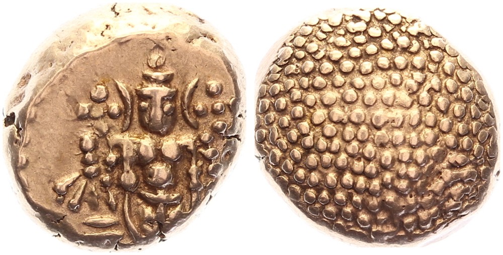 Gouden pagoda z.j. met verbasterd beeld van Vishnu, geslagen te Tuticorn.Scholten 1259; Fr. 1515 [3,36 gram]. Zeer fraai.
