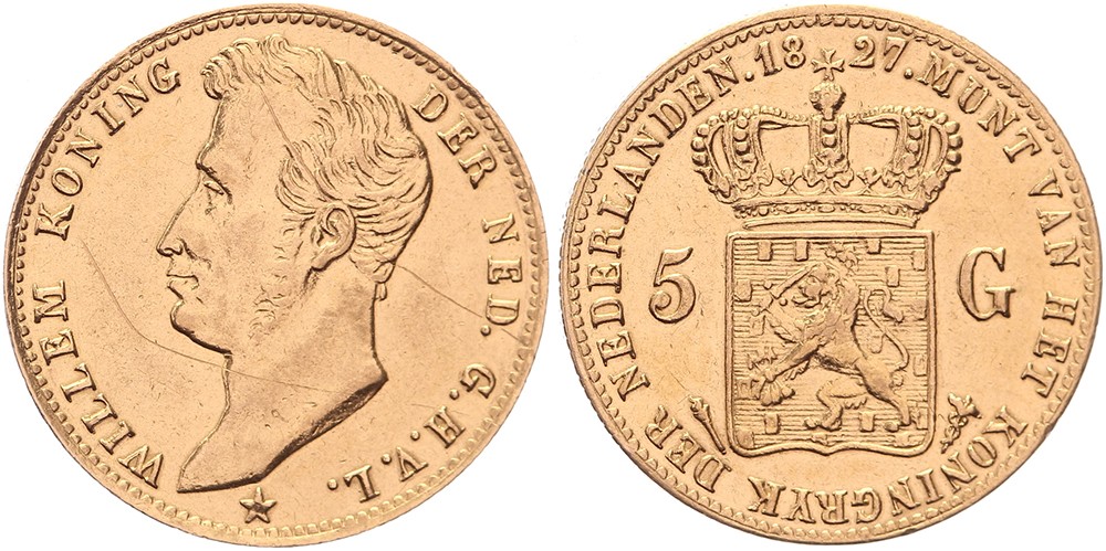 5 Gulden 1827 Utrecht mmt. fakkel Sch. 196. Haarkrasjes in veld Zeer fraai / Prachtig