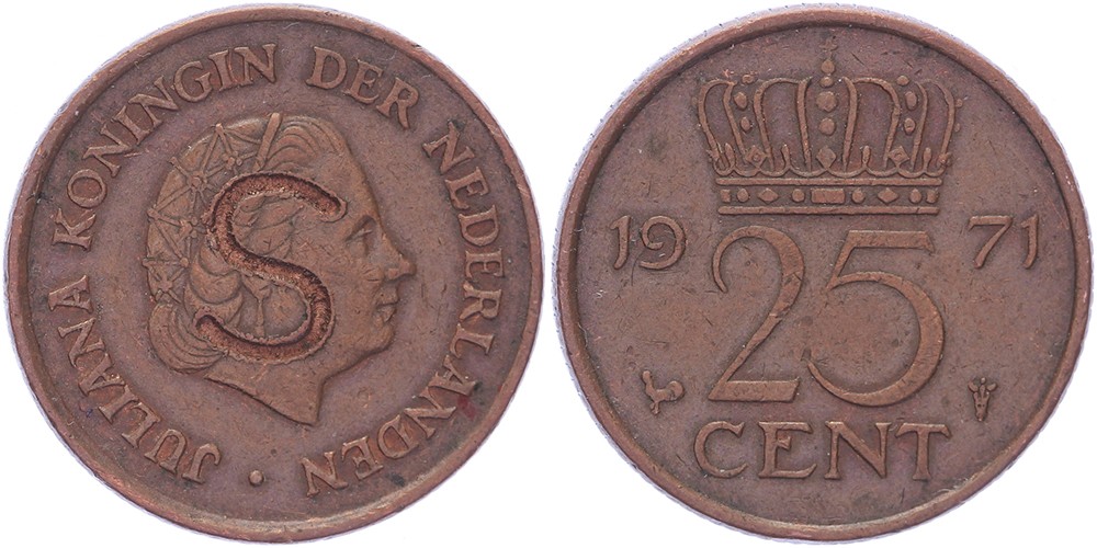 25 Cents 1971. Storingsdienst PTT; Testmuntje voor (nieuwe) telefoonautomaten. Verbronsd nikkel met ‘S’ ingegraveerd op keerzijde. Kooij PT007-9.