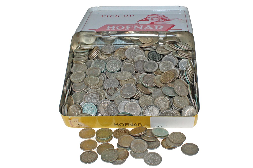 Blikje zilveren dubbeltjes Wilhelmina, laatste type. Netto zilver: 448 gram.
