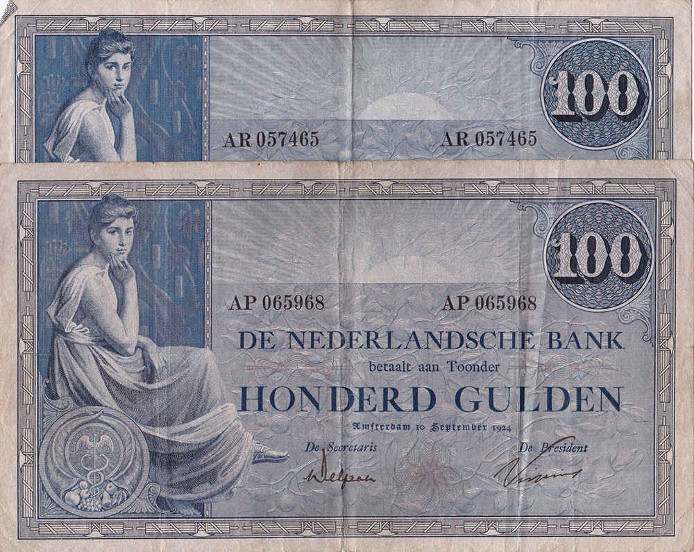 Lot (2) 100 Gulden 1924 Grietje Seel. Mev. 116-2; AV 80.1b.2; PL 96.b2 [# AP 065968 – AR 057465]. Fraai.
