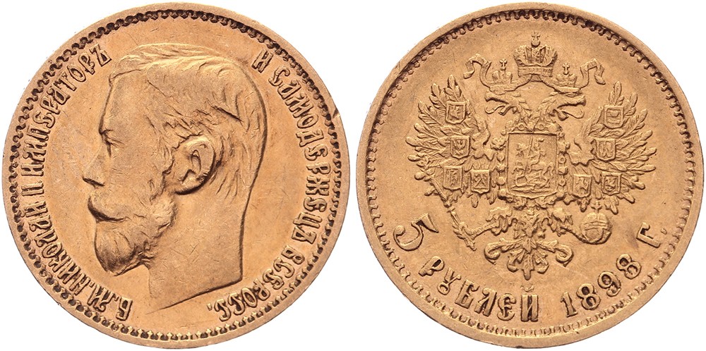5 Roubles 1898AГ. Fr. 180; KM Y62. VF.