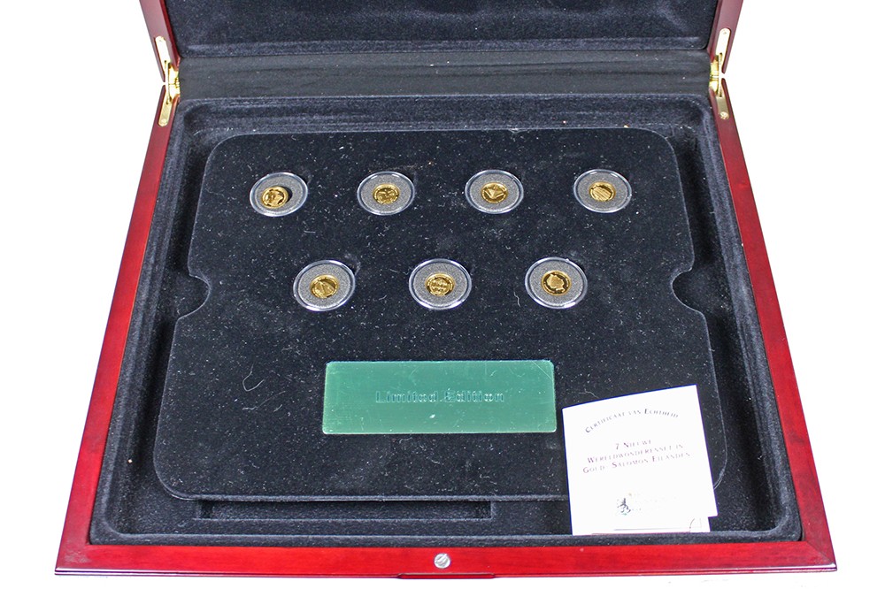 Luxe kist met 7 stuks gouden munten. 10 Dollars Solomon Island. De 7 nieuwe wereldwonderen.