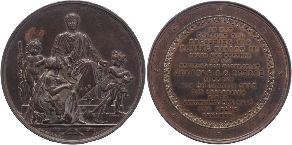 1883 Wet verlegging uitmonding van de Maas. Zittende wetgever, tussen allegorische Waal en Maas, reikt staatsblad aan allegorische Noord-Brabant. / Vijftienregelig opschrift. Æ 75. Zwierzina 581. F. Baetes & L. Jünger. Zeer fraai+.