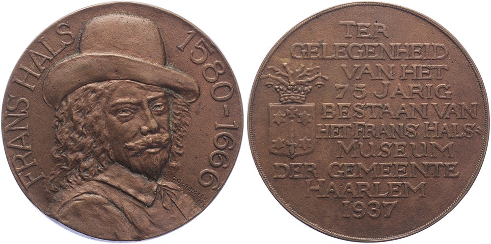 1937 75-jarig bestaan van het Frans Hals-Museum te Haarlem. Borstbeeld Hals half naar rechts met hoed. / Tienregelige tekst en Haarlems wapenschild. Æ gegoten 63. C.L.J. Begeer. Prachtig.