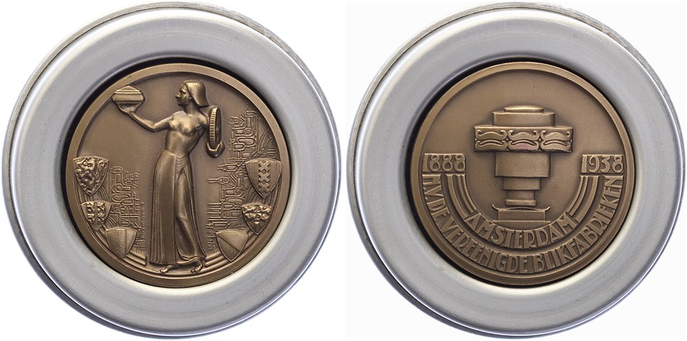 1938 Amsterdam, 50-jarig bestaan Vereenigde Blikfabrieken. Linksgewende vrouw met een blikken trommel in de linker- en een tandrad in de rechterhand, langs de rand de wapens van Nederland, Weesp, Delft, Amsterdam, Rotterdam en Utrecht. / Gedeelte van een trekpers tussen 1888-1938 en opschrift. Æ37. KB V-1214. Hendrik van den Eijnde. In origineel blikken doosje. UNC.