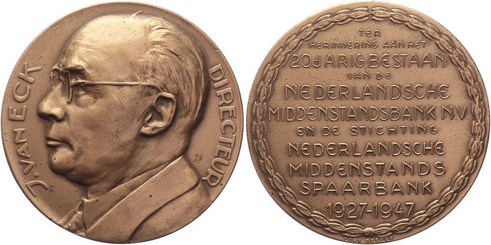 1947 20 Jaar Nederlandsche Middenstandsbank N.V. Portret directeur Johan van Eck naar links. / Elfregelig opschrift. Æ 60. J.J. Both. Prachtig.