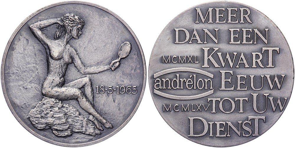 1965 25 Jaar Andrélon. Zittende nimf met handspiegel. / Zesregelig opschrift.AR 35,4. KB VI-3021. (T.A. van den Berg-Been). Niet vaak voorkomend. FDC.N.B. Het shampoomerk ‘Andrélon’ is geïntroduceerd door kapper André de Jong te Bodegraven.
