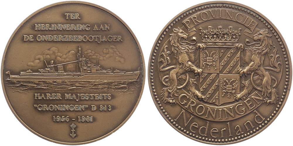 1981. Den Helder. Ter herinnering aan het uit de vaart nemen van onderzeebootjager Hr Ms “Groningen’ D813. De “Groningen” naar rechts varend. / Wapen van de provincie Groningen.Æ 50 mm. (R. Augustinus & H. van Bommel). In origineel mapje van Begeer met beschrijving. UNC.