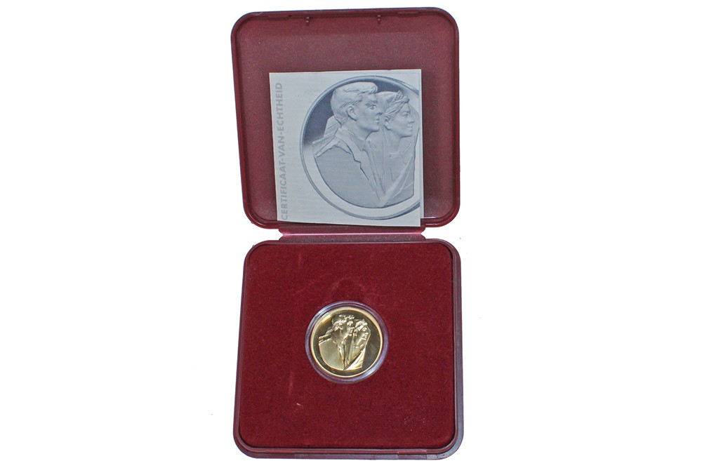 2002 Huwelijk Willem-Alexander & Máxima. Dubbelportret van het bruidspaar naar rechts. / Het bruidspaar bij Beurs van Berlage en de Nieuwe Kerk op de Dam.AU 21 [6,72 gram, 900/1000]. Beeldenaar 2008, pag. 261, nr. 284. Eric Claus. Proof.