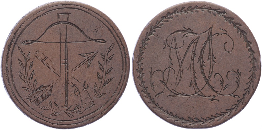 z.j. Schutterijpenning. Verticaal geplaatste handboog boven gekruiste pijl en musket. / Monogram JHC binnen bladerkrans. Æ 32 gegraveerd. Zeer fraai.