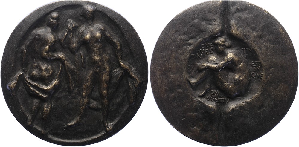 1960 Uitvinding van het medicijn Ovestin. Twee tegenover elkaar staande naakte vrouwen die zich afdrogen. / Zittende vrouw, waaromheen lettervariaties op het woord Ovestin.Æ gegoten 105. (Ed van Teeseling). Prachtig.
