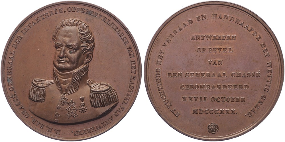 1830 Antwerpen gebombardeerd. Borstbeeld generaal Chassé. / Tekst.Æ 46. Dirks 396; Bax 99. D. van der Kellen. Prachtig.