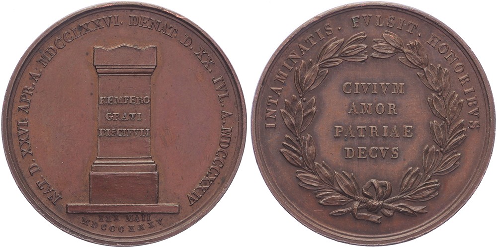 1835 Inwijding van het grafmonument ter ere van professor J.M. Kemper, hoogleraar Romeins Recht aan de Universiteit Leiden in de Sint Pieterskerk. Monument met opschrift, datum en jaartal in de afsnede. / Vierregelige tekst in lauwerkrans. Æ28. Dirks 508; Hofstee 52. J.P.Menger. Prachtig.