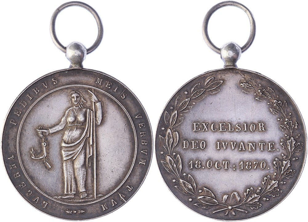 1870 Draagpenning van het Utrechts Theologisch en Literair studentendispuut Excelsior Deo Juvante, opgericht op 18 oktober 1870. Staande vrouw met staf en lamp, omschrift tussen twee cirkels: LVCERNA PEDIBVS MEIS VERBVM TVVM. / EXCELSIOR / DEO IVVANTE / 18.0CT : 1870 in krans van laurier en eikenbladeren. AR 35. Met bol en oog. Vergelijk Donga 102, exemplaar van andere tekening. Prachtig.