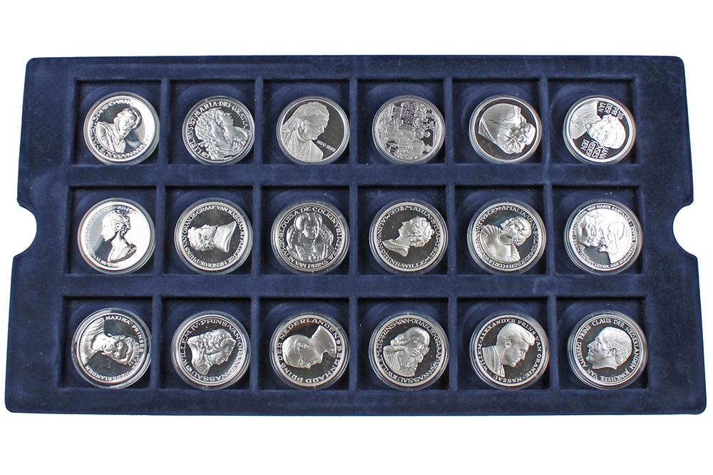 Luxe cassette met 42 stuks zilveren penningen van ons koningshuis. Willem van Oranje tot Willem-Alexander. 31,47 gram per stuk, gehalte 925/1000.