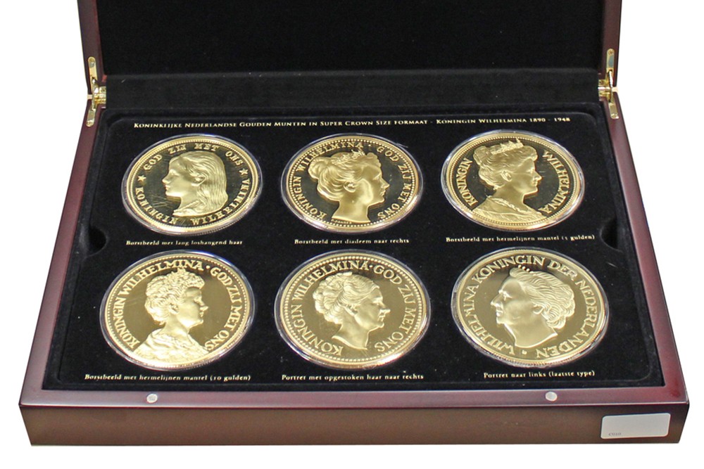 Afdeling bling bling. Prachtig mooie kist met Koninklijk Nederlands Goud inclusief bijbehorende certificaten. 6 fantastische portretten van Wilhelmina en Juliana Ø 88,7 cm, circa 450 gram massief edel brons met 24 karaat goud verguld. Uitgifteprijs meer dan €1.000.