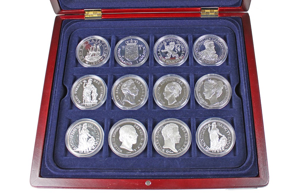 Houten doos van HNM met 15 zilveren en 9 verguld zilveren replica’s van dure Nederlandse munten. Netto zilver: 430 gram + 83 gram verguld zilver.