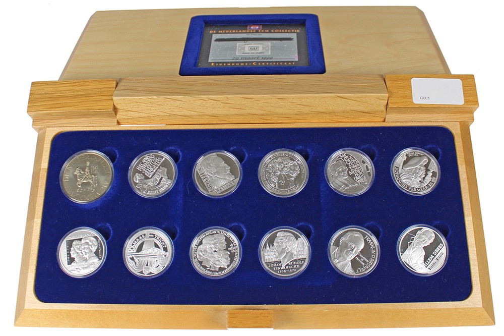 Houten klapcassette “De Nederlandsche Ecu Collectie”, met 11 x zilveren ecu en 1 x nikkel.Netto zilver: 186 gram.