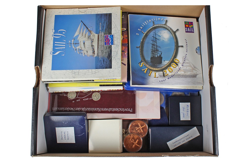 Doos penningsets, o.a. Haagse Jantjes; Sail ’95; Sail ’97 (ook in zilver); Sail 2000; 200 Jaar Koninkrijk; Grootste molens en divers.
