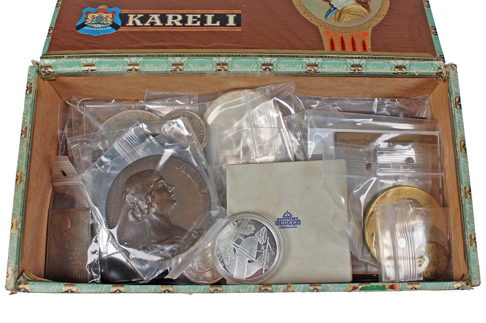 Sigarenkist diverse penningen in zakjes, voornamelijk Nederland, maar ook enkele buitenlandse penningen.