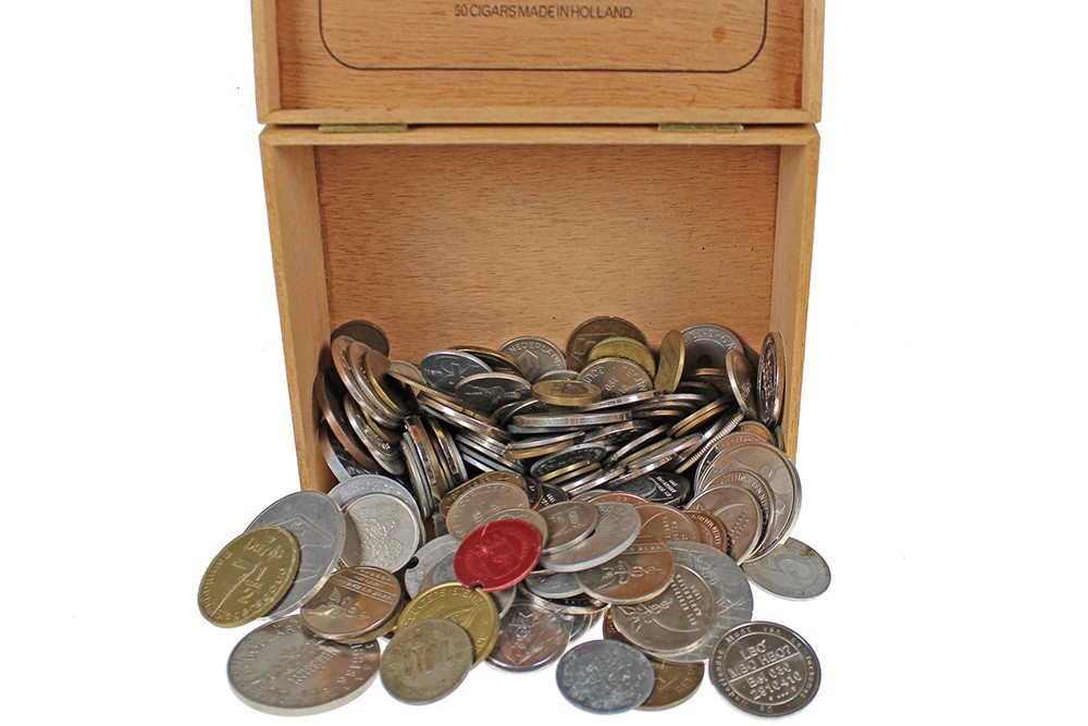 Kistje met reclamepenningen, kantinepenninkjes enz. enz. Zeer divers.