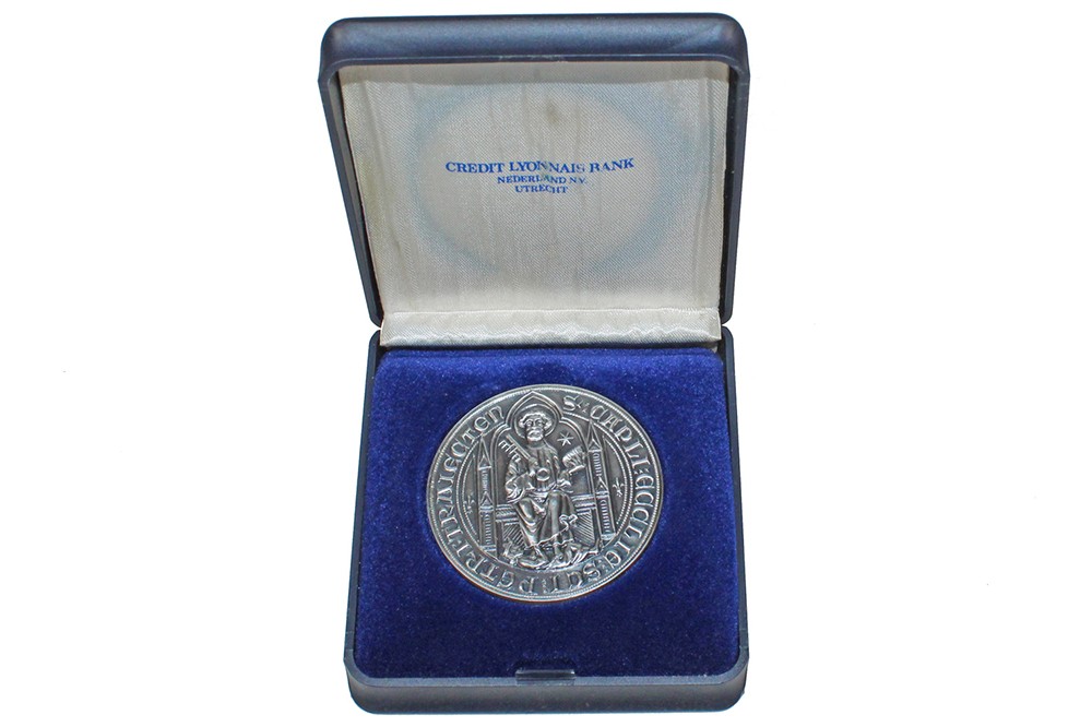 Doos met 96 stuks verzilverde penningen van de Waalse kerk in Utrecht, 1983, Ø 50 mm.Destijds geslagen in opdracht van Credit Lyonnais Bank te Utrecht. UNC in cassette.