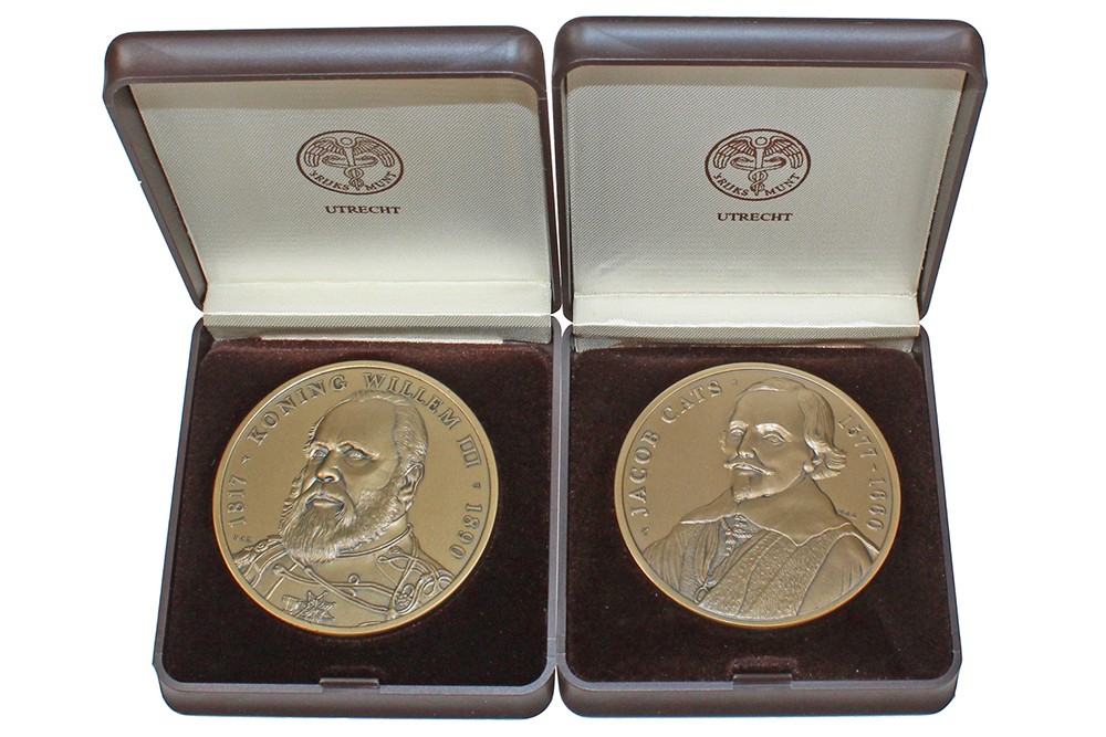 Doos met 40 stuks penningen voornamelijk Koning Willem III en enkele van Cats. Gepatineerd brons Ø 60 gewicht ca. 120 gram. Grotendeels in luxe cassette. Product van ’s Rijks Munt, Utrecht.