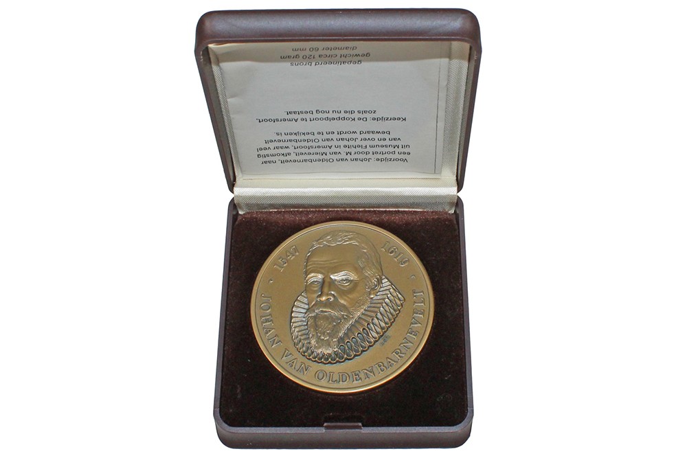 Doos met 40 stuks penningen van Johan van Oldenbarnevelt 1547-1619. Gepatineerd brons Ø 60 gewicht ca. 120 gram. Grotendeels in luxe cassette. Product van ’s Rijks Munt Utrecht.
