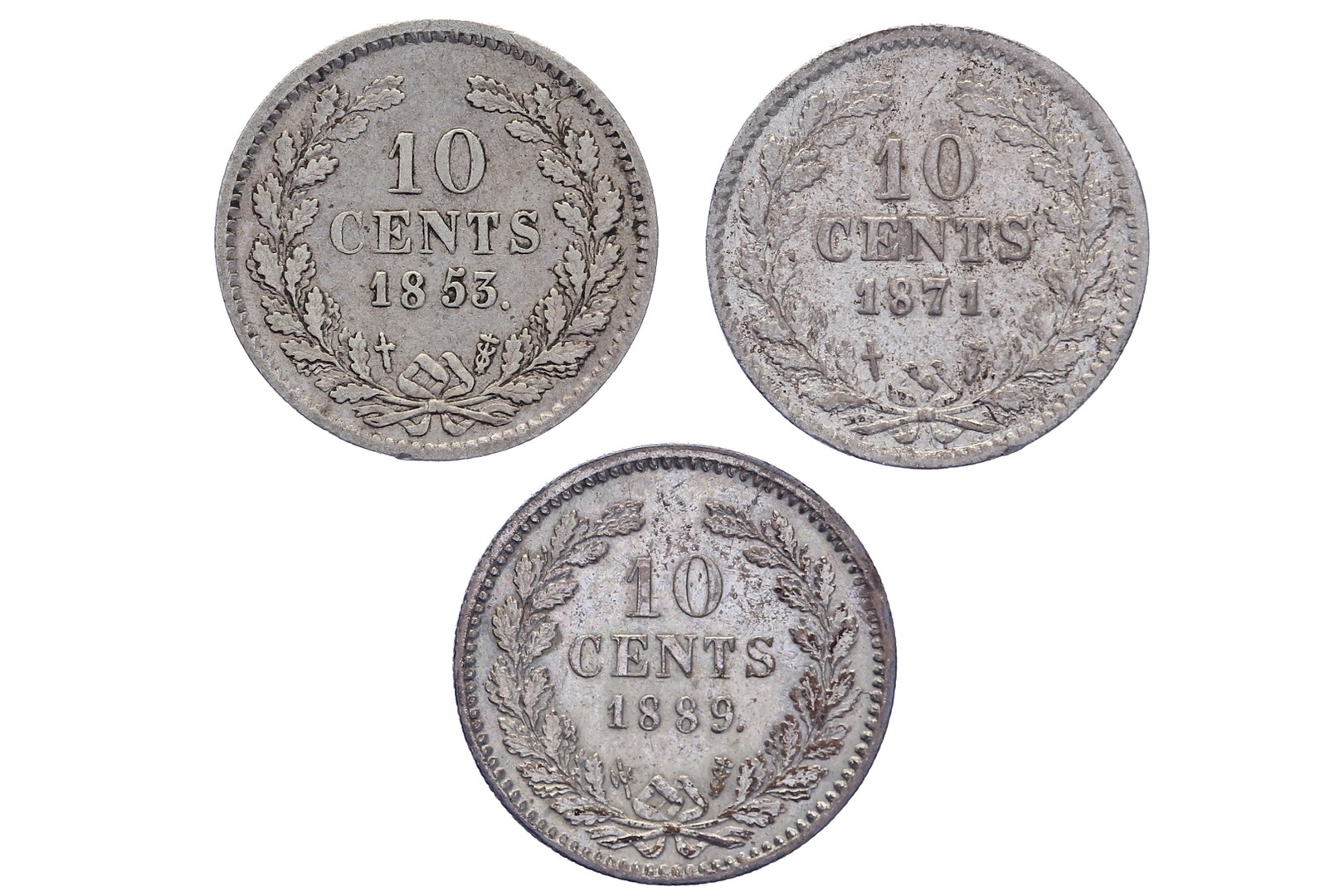 Lot (3) 10 Cents 1853, 1871 en 1889 Sch. 642, 650 en 664 Fraai / Zeer fraai