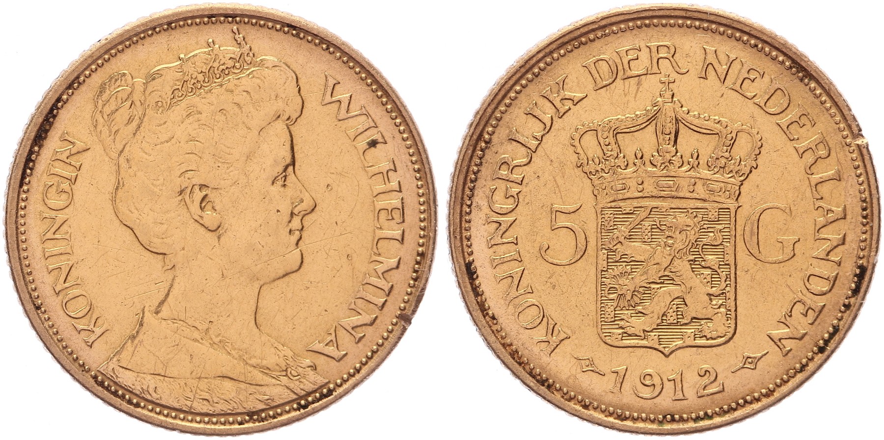 5 Gulden 1912 zonder mmt. Sch. 754. Gepoetst Zeer fraai