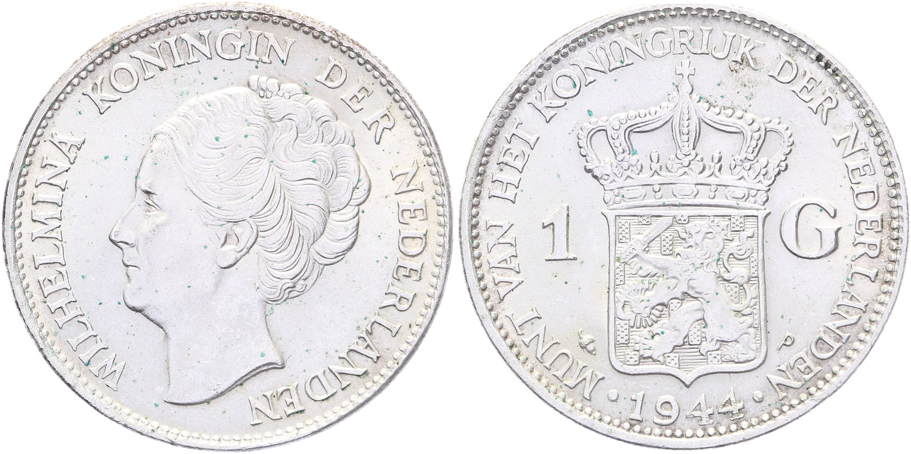 1 Gulden 1944P mmt. eikel Sch. 1055a. Doorlopend omschrift Prachtig