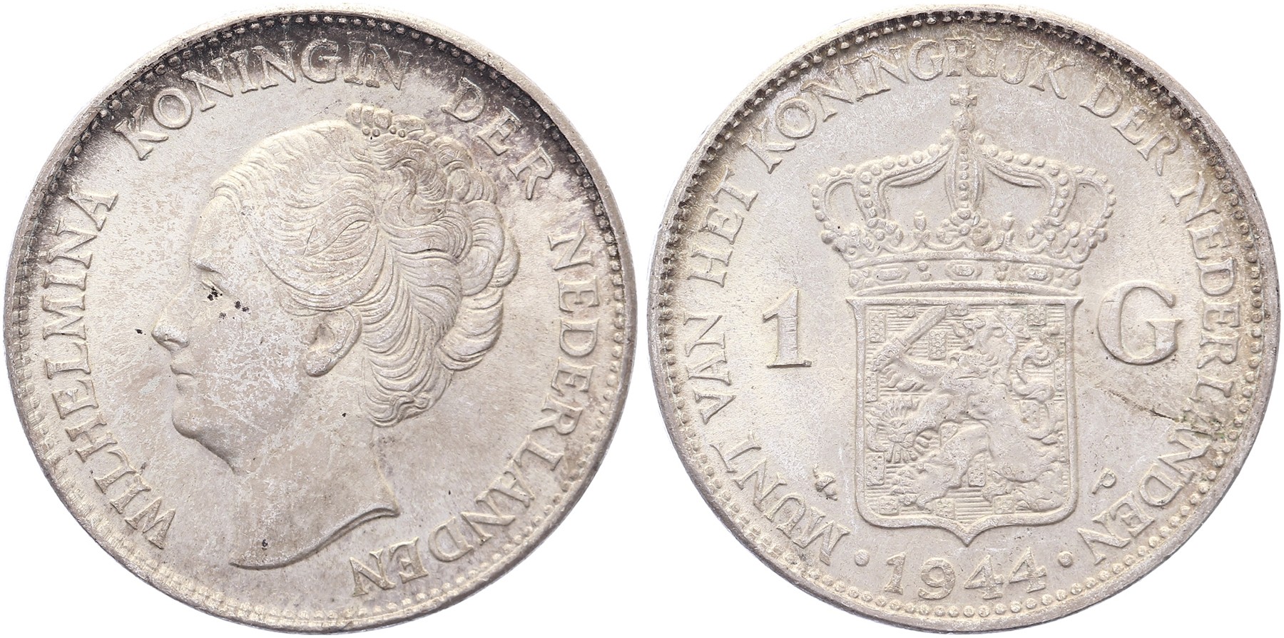 1 Gulden 1944P mmt. eikel Sch. 1055a. Doorlopend omschrift Ruim zeer fraai