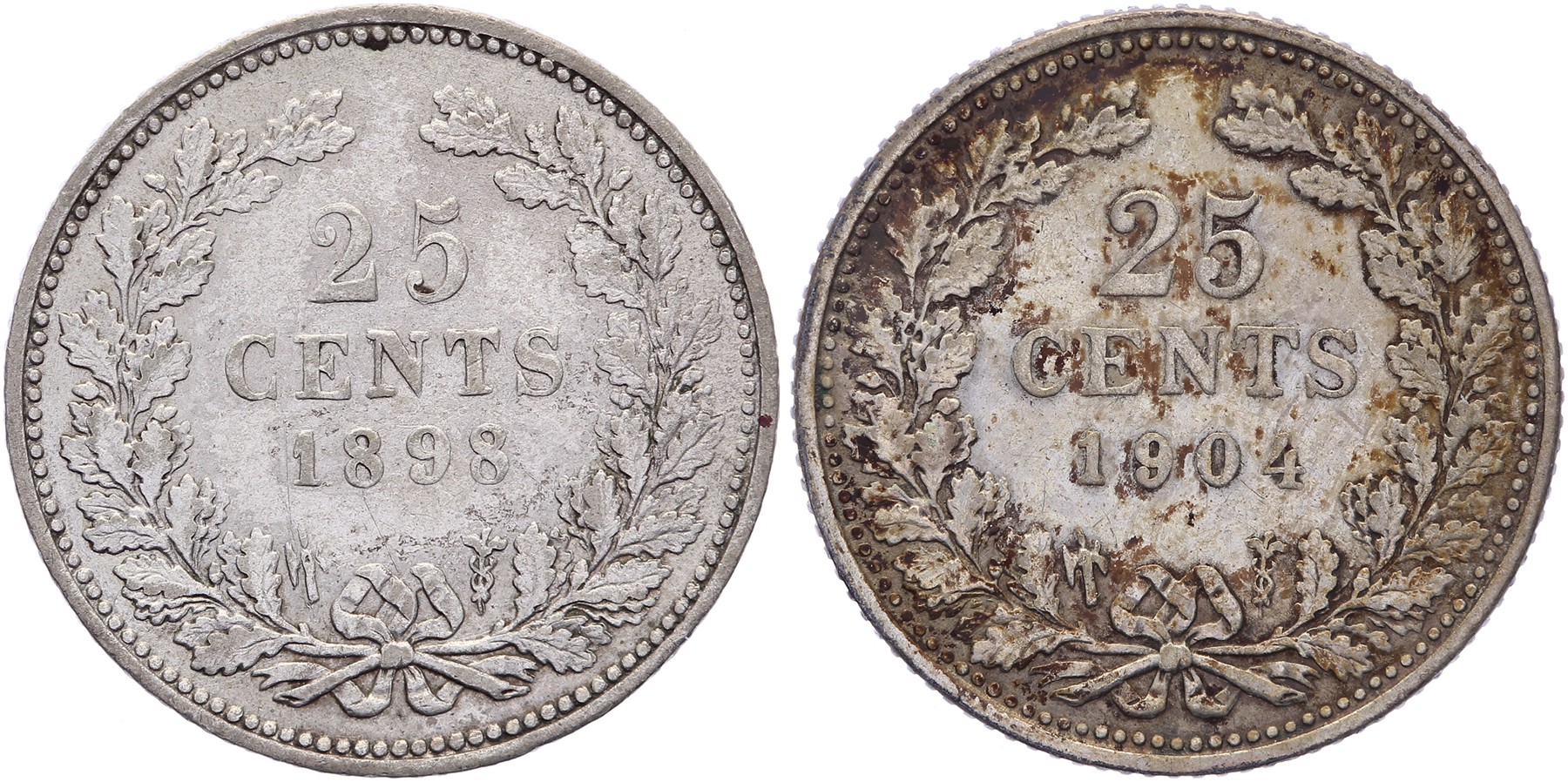 Lot (2) 25 Cents 1898 en 1904 mmt. hellebaard Sch. 853 en 857 Fraai / Zeer fraai