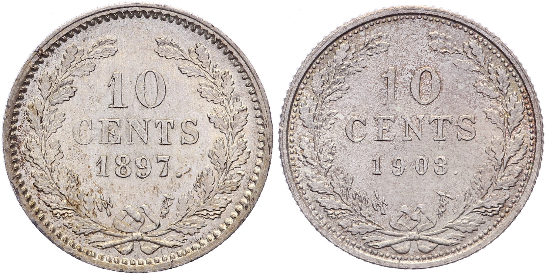 Lot (2) 10 Cents 1897 en 1903 Sch. 882 en 885 Zeer fraai / Prachtig