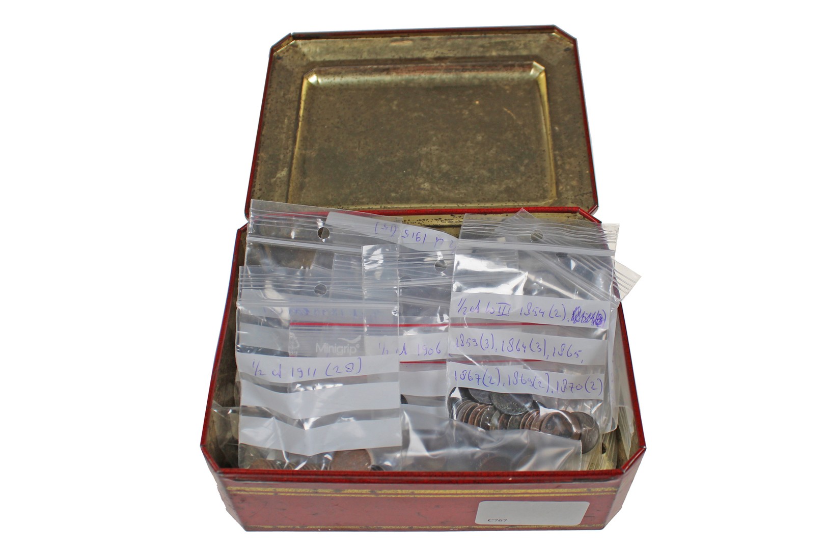 Mooi blikje met leuk aantal ½ centen, o.a. 1891 (15), 1894 (26), 1898 (8), 1900 (7), 1901 (22), 1903 (64), 1906 (26), 1909 (33), 1911 (28), 1912 (44), 1915 (15), 1916 (22), 1917 (21), 1922 (32), 1928 (12), 1930 (63), 1934 (34), 1936 (15), 1937 (76), 1938 (63), 1940 (33), diverse jaren (65). Totaal ca. 650 stuks.