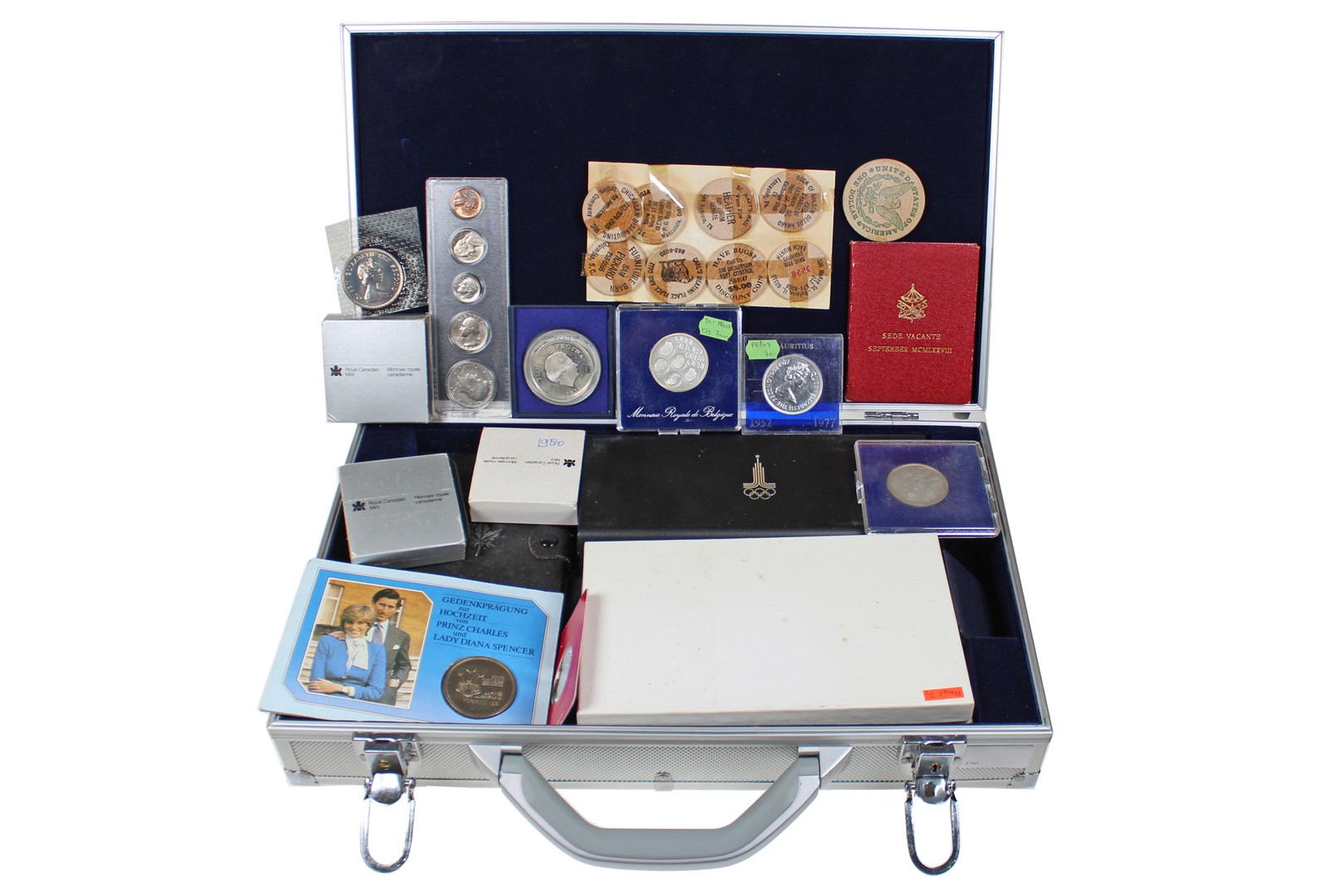 Aluminium koffertje met voornamelijk zilveren herdenkingsuitgiften wereld o.a. Canada, Rusland, USA, België, Israël, Frankrijk etc. Ca. 15 stuks. Veel proof.