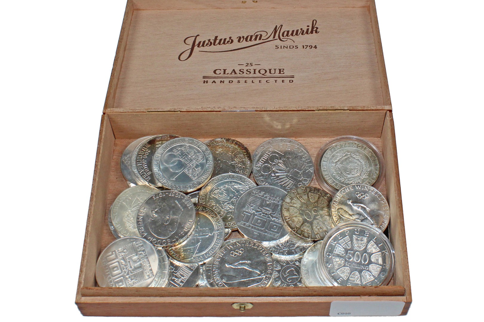 Kistje met Oostenrijks zilver; 2 x 500 SH; 24 x 100 SH; 9 x 50 SH; 1 x 25 SH. Totaal ATS 3875.
