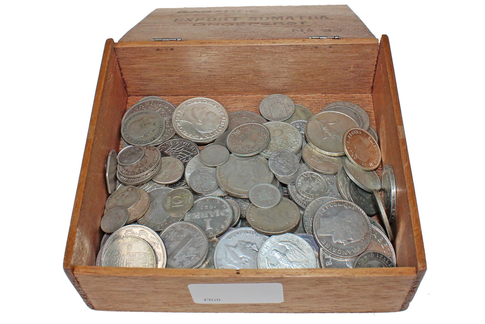 Kistje met onuitgezocht wereld, voornamelijk zilveren munten.