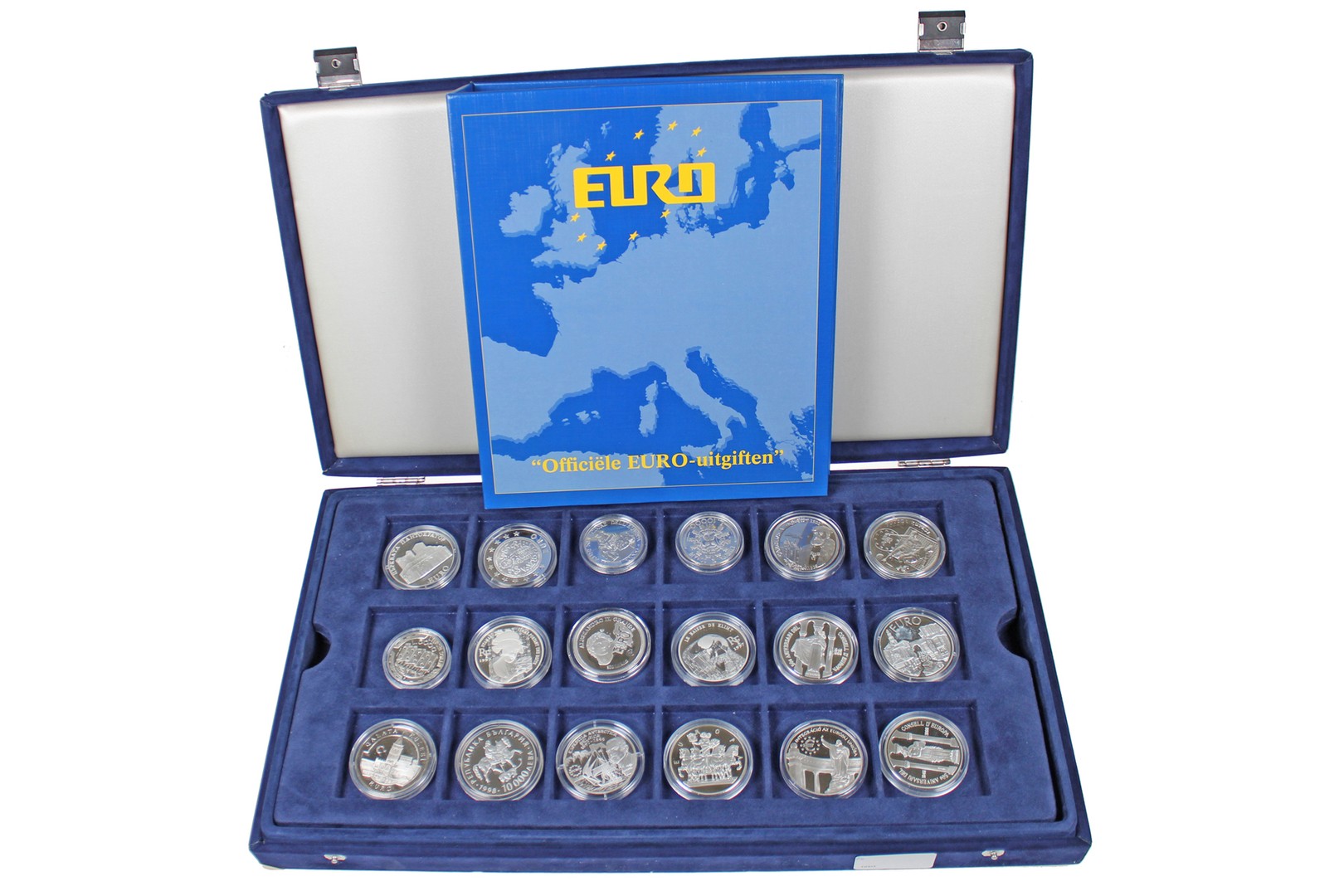 Langwerpige blauw cassette “officiële EURO-uitgiften / The Offical EUROs / Les EUROs officiels”. Incl. bijbehorende info van 54 zilverstukken. Netto zilver ca. 1284 gram.